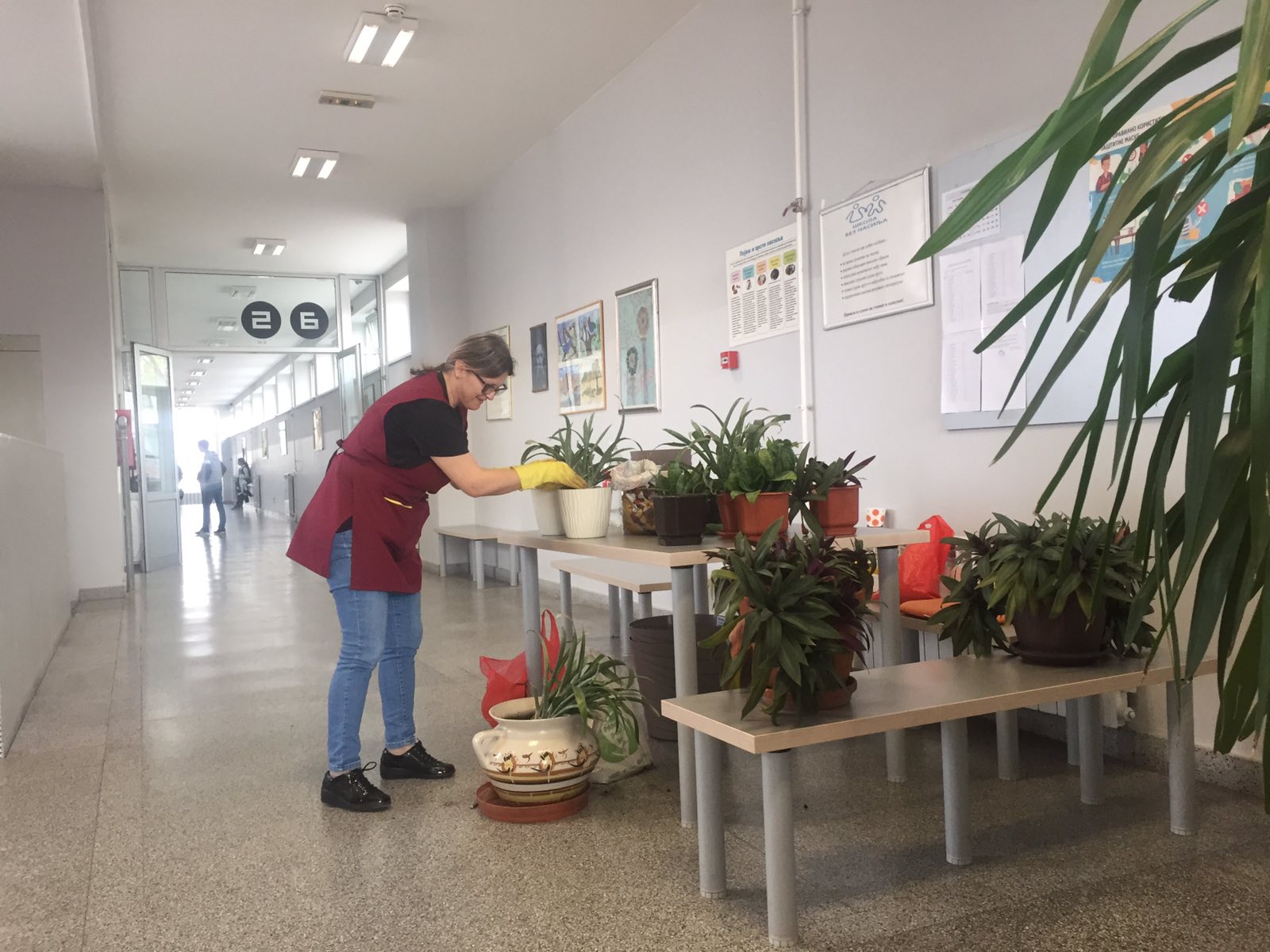 Поносна је на веееликог бенџамина, дрво живота, адама који се спрема да процвета по други пут за годину дана. То је, каже Борка онако успут док чепрка у рукоавицама око корења, ретка појава, али има објашњење. Ми смо, углавном, женски колектив, такорећи све Еве, па је Адаму лепо међу нама. Љубичаста детелина, слоново уво, фикуси, спатифилијум, пузавице, алоје, јука и кактус „свекрвин језик“ траже негу, али она не мањка када је наша драга „теткица“ расположена. Не смета цвећу ни по која чаша топле воде, соц од кафе, мало сока. Неретко, од куће донесемо по коју саксију сасушене и беживотне биљке којој удахне живот и потпуно је опорави вредна Борка. Могла би, кад следећи пут крене у сличну акцију, да заинтересованим ученицима одржи кратак курс из хортикултуре, јер – лепо је живети са цвећем.
